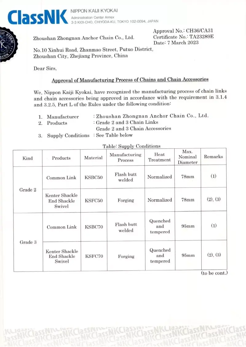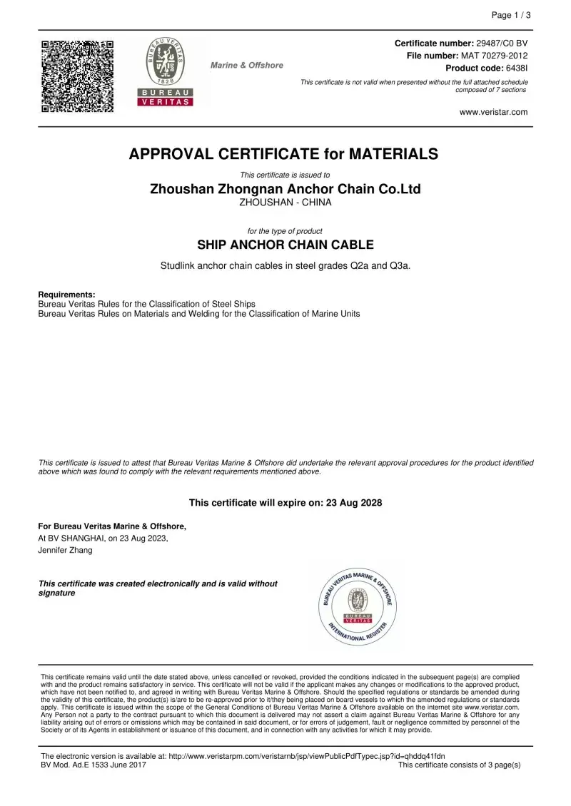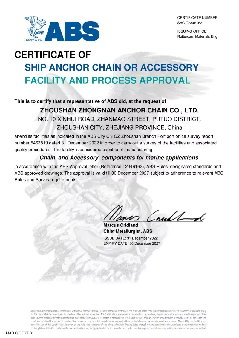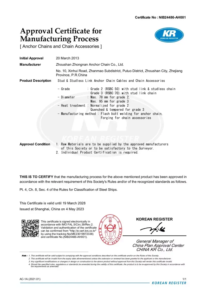 Đúng. Mỗi chuỗi được sản xuất trong nhà máy của chúng tôi đều có chứng nhận từ các xã hội phân loại quốc tế hàng đầu, như CCS, ABS, DNV, BV, LR, NK, Rina, KR và R. Các chứng chỉ này chứng thực việc tuân thủ chuỗi các tiêu chuẩn IAC và ISO và các thông số kỹ thuật tải và tải trọng của nó.