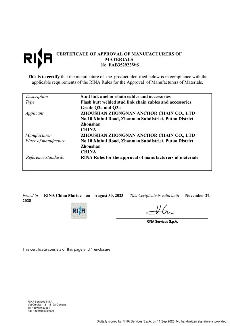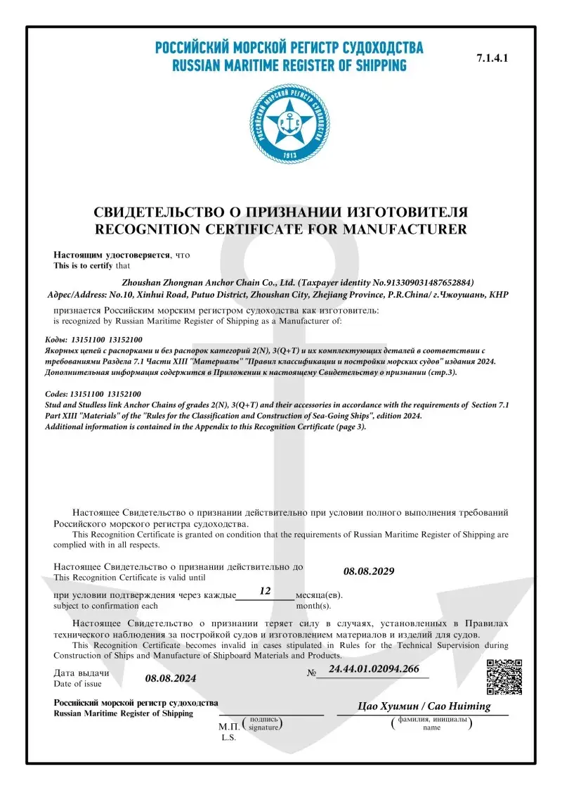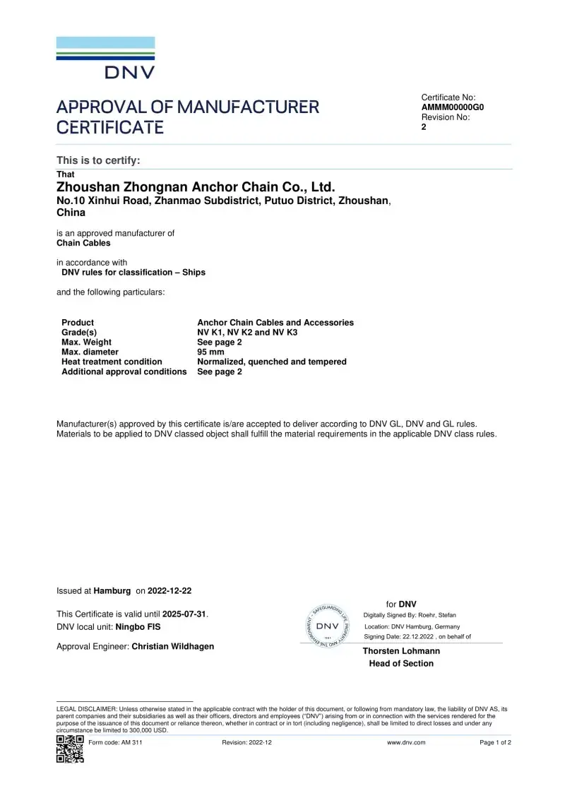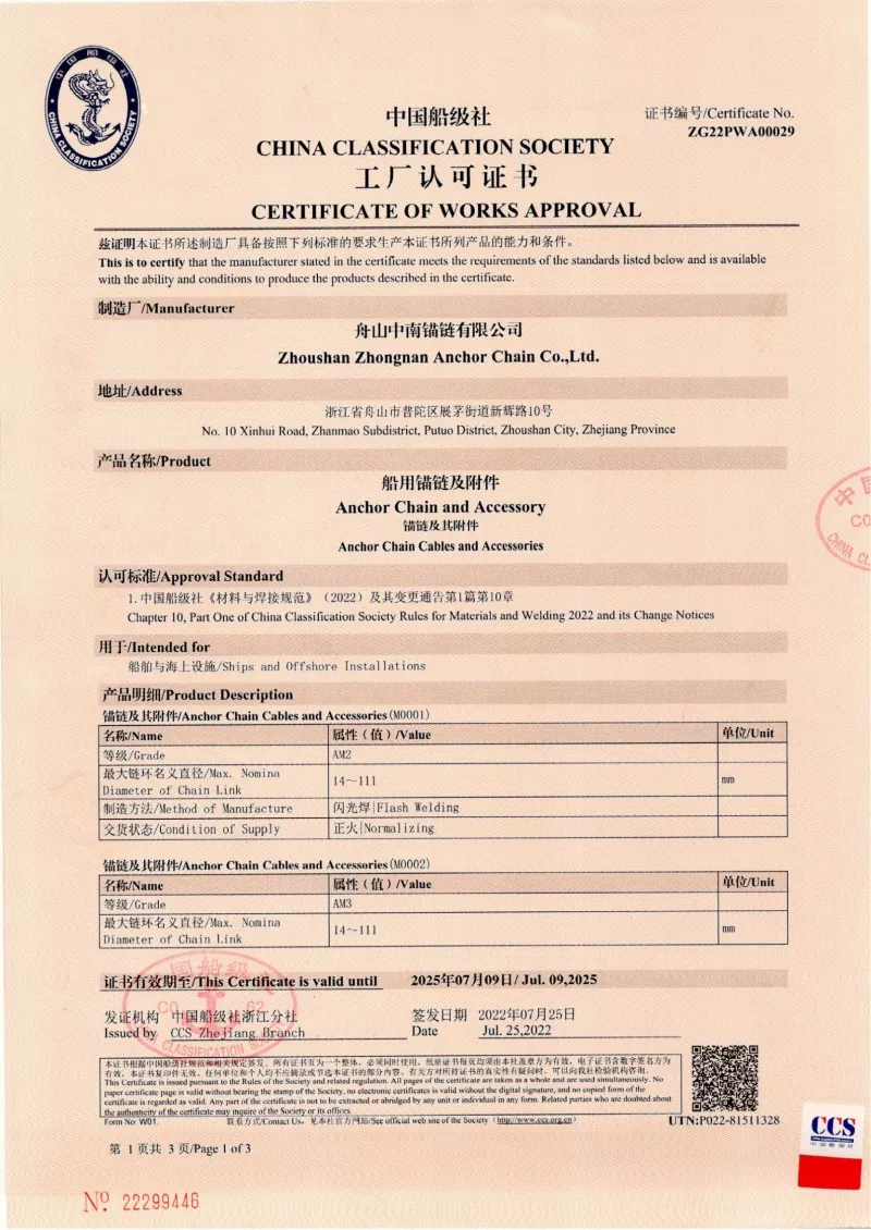 Đúng. Mỗi chuỗi được sản xuất trong nhà máy của chúng tôi đều có chứng nhận từ các xã hội phân loại quốc tế hàng đầu, như CCS, ABS, DNV, BV, LR, NK, Rina, KR và R. Các chứng chỉ này chứng thực việc tuân thủ chuỗi các tiêu chuẩn IAC và ISO và các thông số kỹ thuật tải và tải trọng của nó.